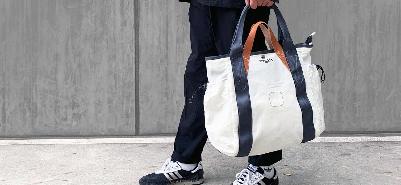 ハンドルの間隔を広くし、シートベルトのハンドルを肩にかければショルダートートとなり、ヌメ革ハンドルを持てばトートバッグになる。このユニークなバッグは、yoccattaのオリジナルデザインで、「Wハンドルトート」と名付けました。